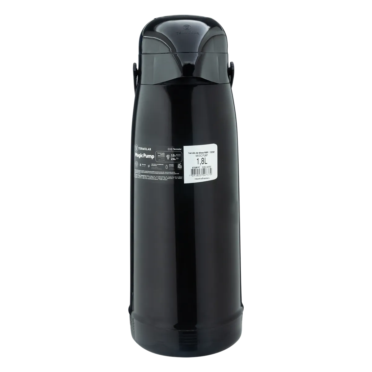 Com capacidade para 1,8 litros, possui sistema de bomba exclusivo com jato forte e preciso, que facilita o manuseio e evita respingos. Seu revestimento externo em polipropileno (PP) garante resistência e durabilidade, enquanto a ampola de vidro interna assegura a conservação térmica de, no mínimo, 6 horas.
